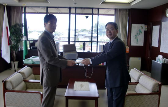 北田原工業会豊田会長が平成23年6月3日(金)生駒市役所を訪れ、被災地の方々へ少しでもお役に立てればと、義援金30万円を山下市長に手渡しました。